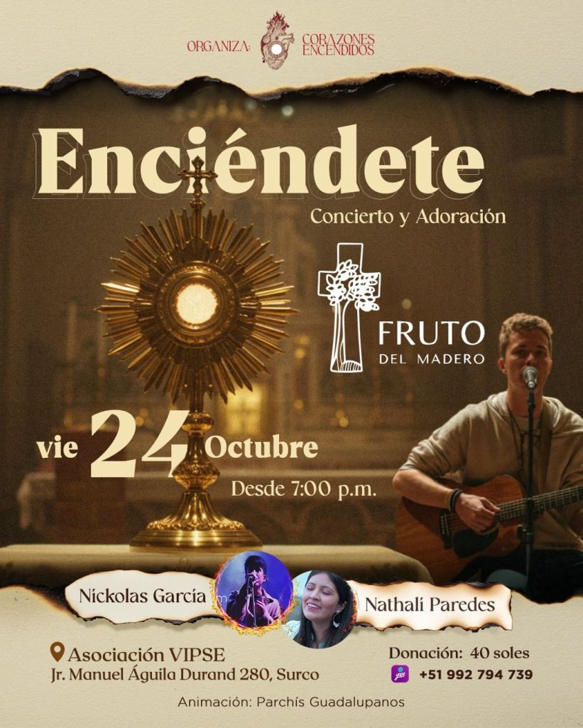 La cita es el viernes 24 de octubre en la Asociación VIPSE (Surco), bajo la organización de la Comunidad Corazones Encendidos, movimiento dedicado a la evangelización a través de la música y la oración.